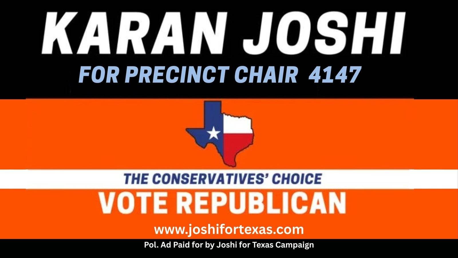 My name is Karan Joshi, and I’m ready to defend our conservative principles, protect our communities, and put Texans first—always. Let’s take our government back and build a brighter future for Texas.